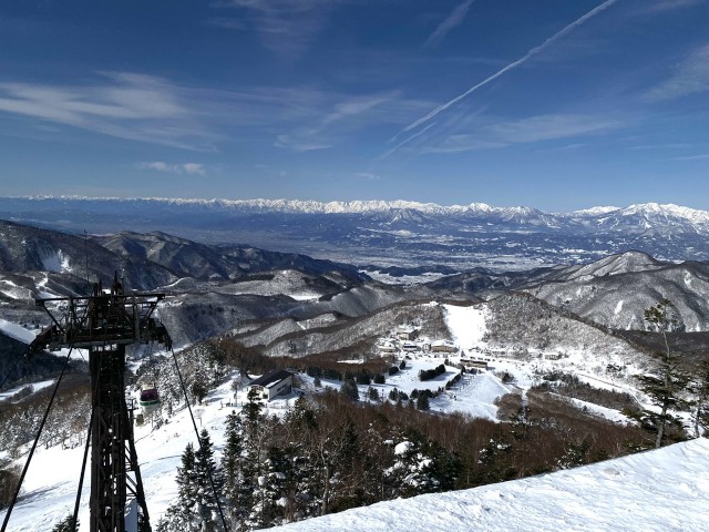 日本海まで見渡せる山の景色を見ながらのスキーは最高に気分がいいですね。